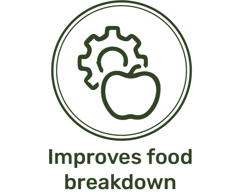 People with poor gut health often struggle to digest certain foods, proteins, fats, or carbs. When food isn’t broken down fully, it can sit in the gut and cause gas,. bloating, stomach pain, nutrient malabsorption, and more. Our digestive enzymes do the work for you, like break down foods into smaller absorbable nutrients. Undigested food ferments in the intestines, leading to gas and pressure. Enzymes help prevent this by ensuring food is digested faster and more completely, so you don’t feel heavy or swollen after meals. Poor gut health often means you’re eating enough but not absorbing what your body needs. With enzymes, vitamins, minerals, and amino acids are freed up and absorbed better, giving your body more fuel for energy, immunity, and repair. Digestive Enzymes work for your body, allowing you to enjoy food again.